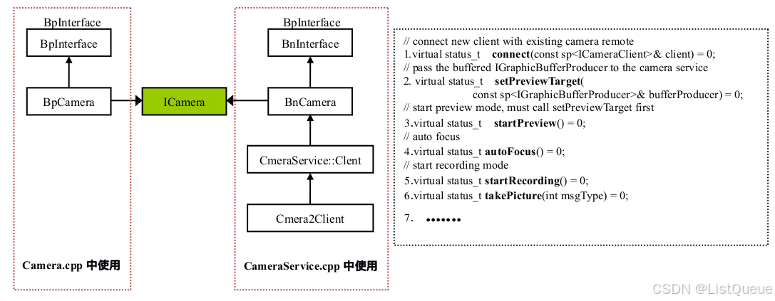 该类是Camera控制的主要接口类,客户端和Service端都会实现ICamera接口类。客户端进程以匿名binder的形式,与mediaServer进程的CameraService进行通信。下面列举一些我个人认为有必要深入了解的接口。