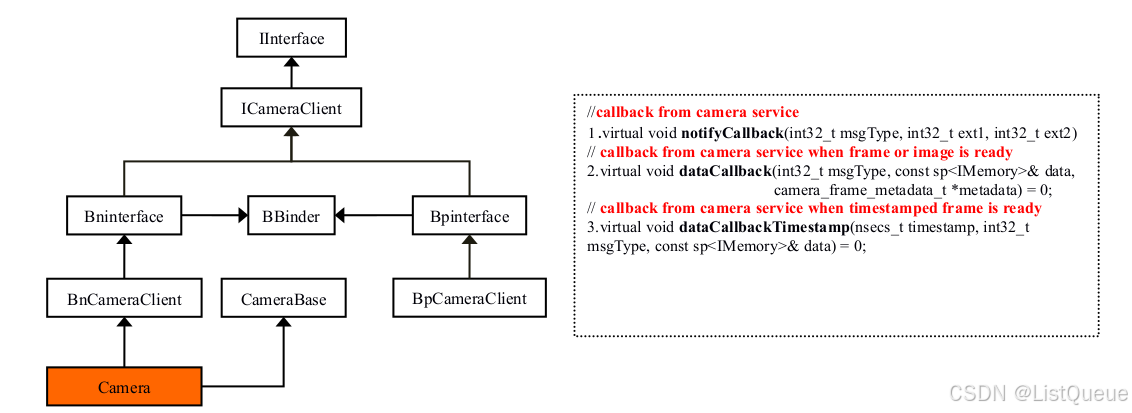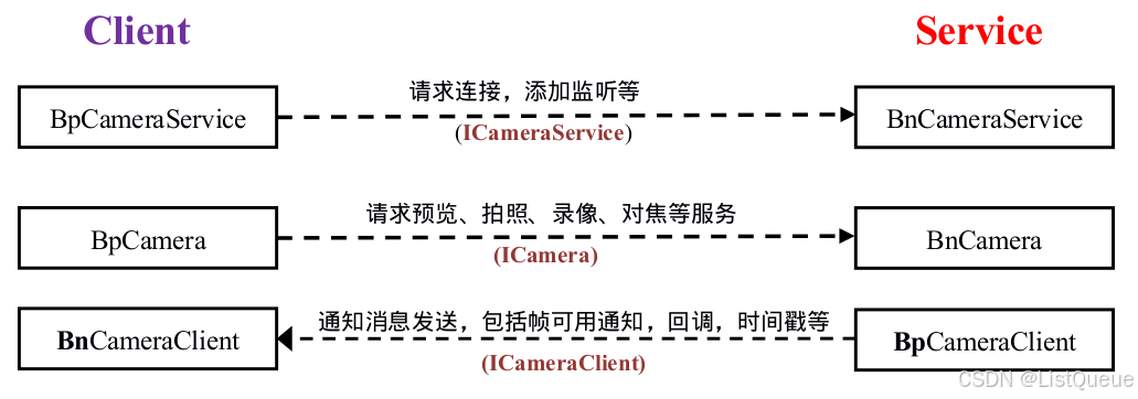 - 1.ICameraClient: 这主要是一些消息发送的接口,包括帧可用通知,回调一些信息给client等消息。不过这里要注意的是,BnCameraClient对象其实是在client这端,不在CameraService端。