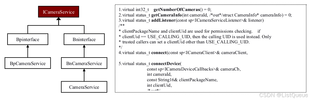 这里是CameraService的继承关系,右侧是我列举的一些个人认为比较重要的函数。ICameraService中总共有12接口,我们只介绍下面几个。