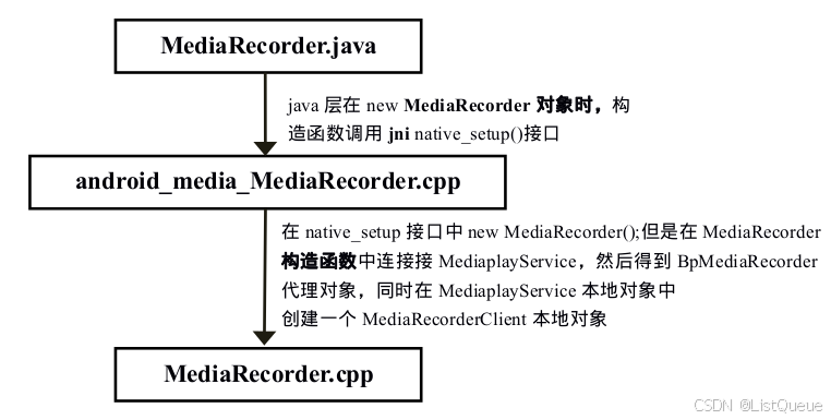 在jni中创建mediaRecorder对象时,其实在构造函数中偷偷的链接了mediaPlayerService,这也是Android习惯用的方法。获取到MediaPlayerService代理对象后,通过匿名binder获取mediaRecorder代理对象。