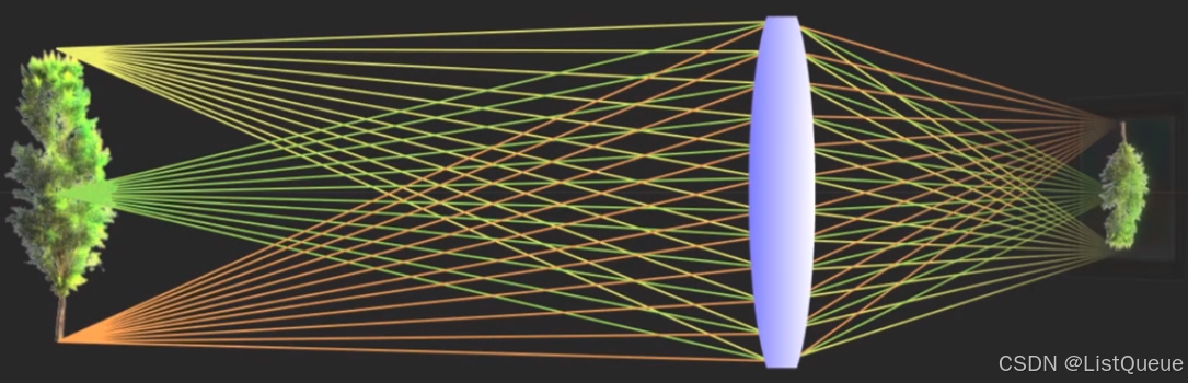 一个物体由无数个点光源组成,单个点光源从各个方向发出光线经透镜折射后都将汇聚在一点上,最终所有点光源都投射在一个平面上,