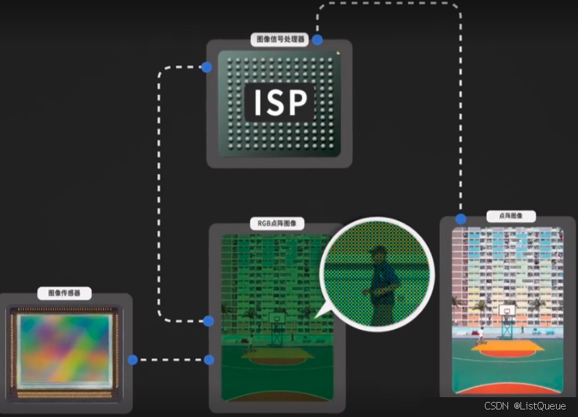 图像传感器的信息输出后是Bayer式排列的RGB点阵,必须要经过ISP图像信号处理器处理转化为常见的点阵图片。