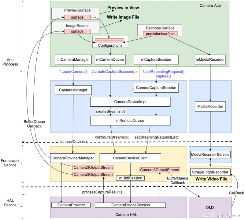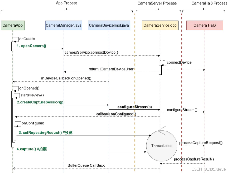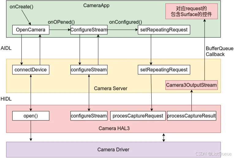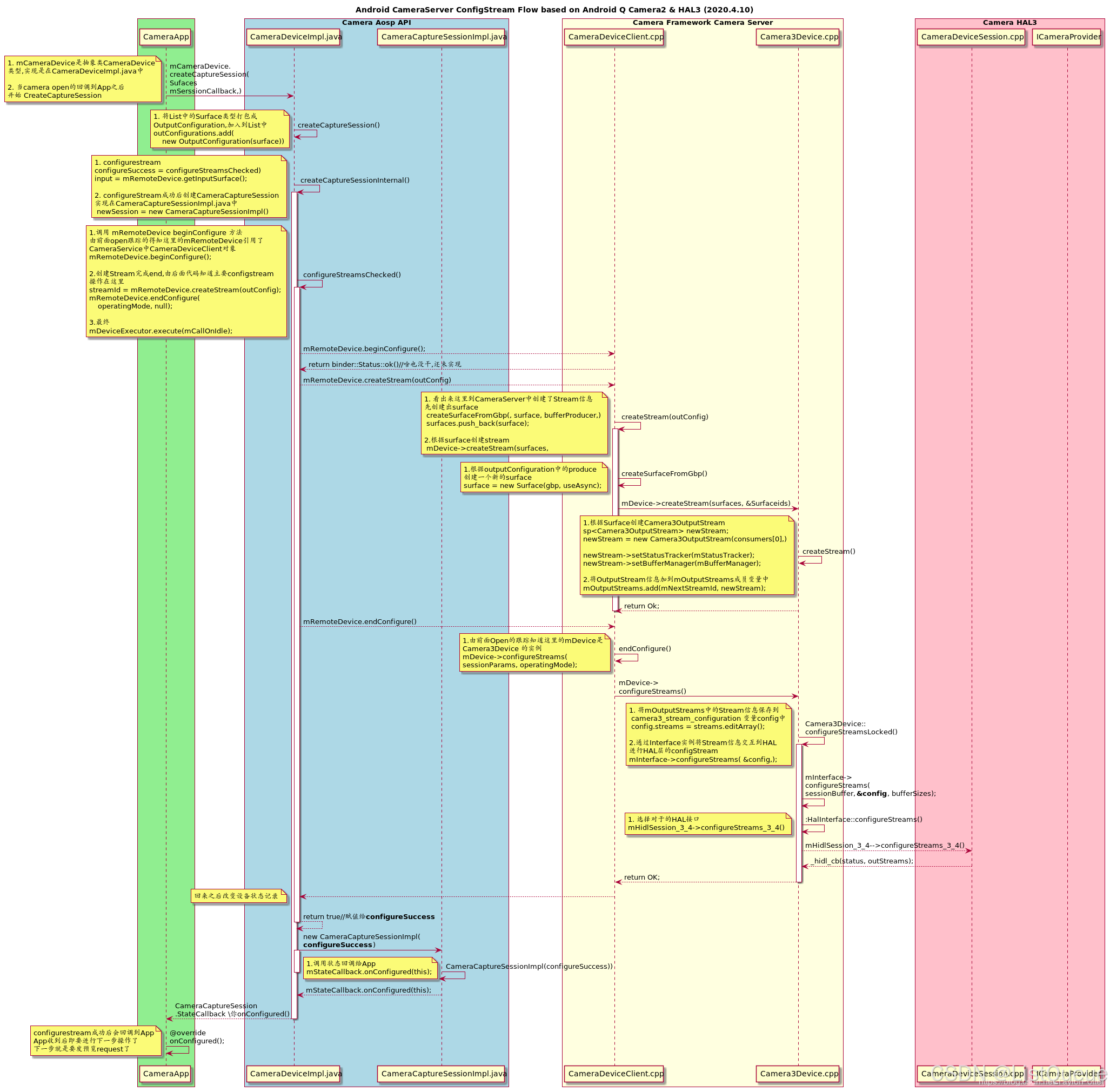 3 openCamera成功会有回调从CameraServer通知到App,在onOpenedCamera或类似回调中去调用类似startPreview的操作.此时会创建CameraCaptureSession,创建过程中会向CameraServer调用ConfigureStream的操作,ConfigureStream的参数中包含了第一步中空间中的Surface的引用,相当于App将Surface容器给到了CameraServer,CameraServer包装了下该Surface容器为stream,通过HIDL传递给HAL,继而HAL也做configureStream操作