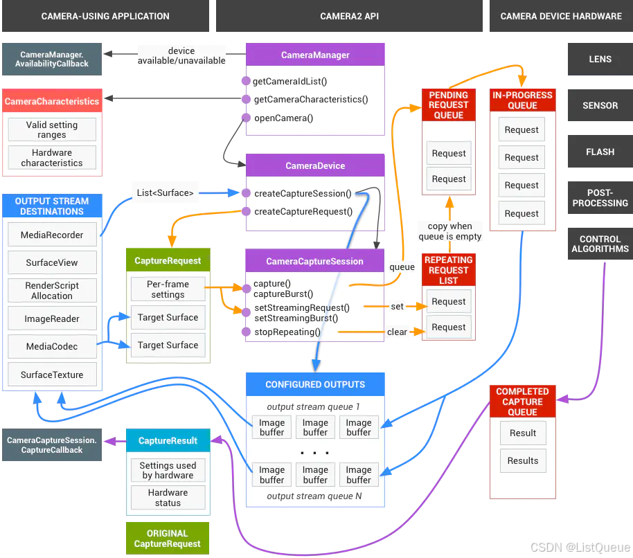 1.应用向相机子系统发出request,一个request对应一组结果.request中包含所有配置信息。其中包括分辨率和像素格式;手动传感器、镜头和闪光灯控件;3A 操作模式;RAW 到 YUV 处理控件;以及统计信息的生成等.一次可发起多个请求,而且提交请求时不会出现阻塞。请求始终按照接收的顺序进行处理。