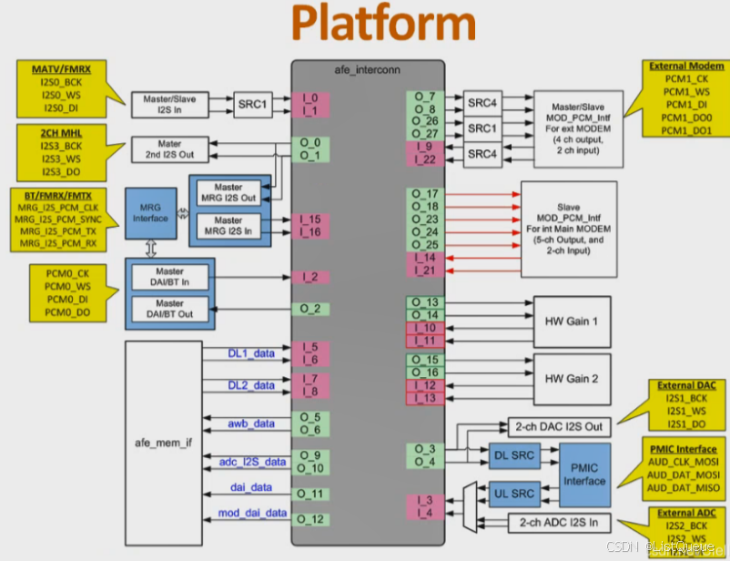 Codec 里面包含了 I2C 接口,DAC,ADC,Mixer,PA(功放),通常包含多种输入(MIC,Line-in,I2S,PCM) 和多个输出(耳机,喇叭,听筒,Line-out),Codec 和 platform 一样,是可得用的 -