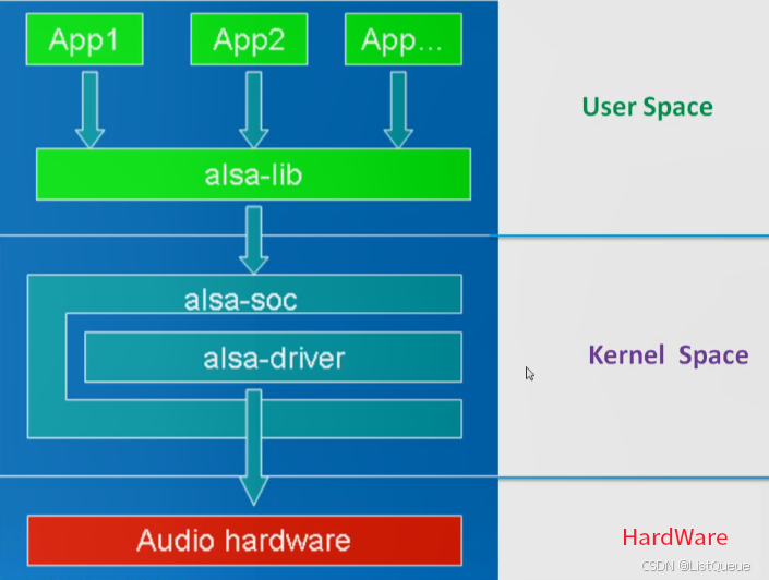 在应用层,ALSA 为我们提供了 alsa-lib ,应用程序只要调用 alsa-lib 提供的API ,即可完成对音频硬件的控制。