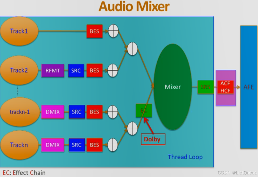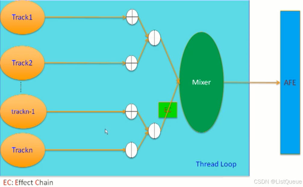 (2)有些Track 有音效的需求,比如假设 Track n-1 和 Track n ,这两个Track 有相同的音效的需求,我们会先把它俩 Mixer 在一起,然后再经过 EC (Effect Chain) 的音效处理后,再和 其他的Track Mixer 后,送到AFE硬件 中播放。