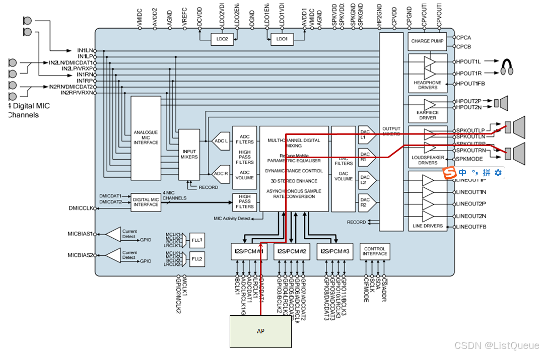 比如: 播放音乐时,Mixer 之后的数据会从 I5、I6 进来,然后将数据往 O3、O4送到 PMIC,PMIC 最终会从耳机或喇叭播放出来。