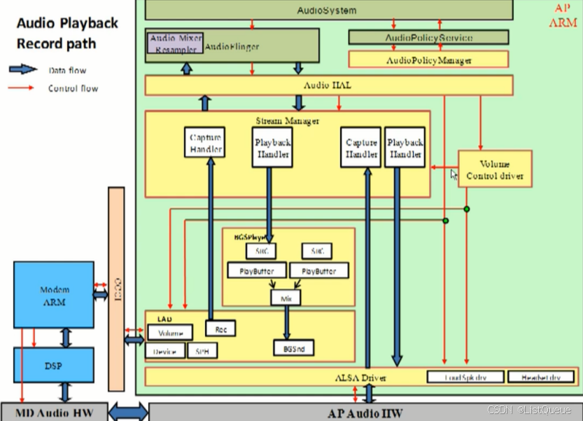 则 AudioSystem 会先在 Stream Manager 中创建 PlaybackHandler ,将数据送到 BGSPlayer, BGSPlayer 会将相关的音频数据送到Modem 中,在Modem 中会把打电话的声音 和 Audio 声音 Mixer 混合在一起,然后再送给 MD Audio HW ,通过 AP Audio HW 播放出来。如果在打电话的时候,还想录音: