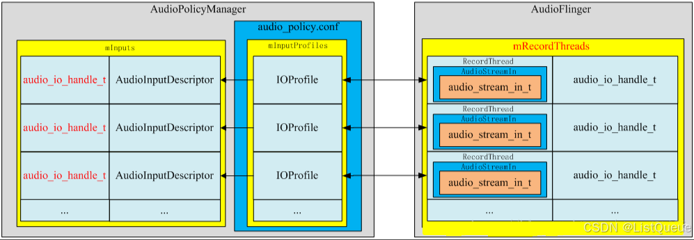 打开音频输入后,在AudioFlinger与AudioPolicyService中的表现形式如下: