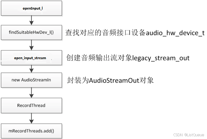 - 打开音频输入时创建一个audio_stream_in通道,并创建AudioStreamIn对象以及创建RecordThread录音线程。