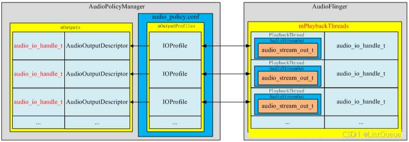 打开音频输出后,在AudioFlinger与AudioPolicyService中的表现形式如下: