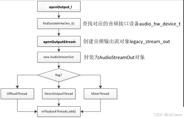 - 打开音频输出时创建一个audio_stream_out通道,并创建AudioStreamOut对象以及新建PlaybackThread播放线程。