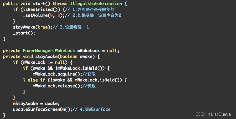 start方法用于start或者重新恢复播放,如果playback先前已暂停,playback将开始从paused状态变成在start状态,如果playback已经是stopped,或之前从来没有started过,playback将会开始start。