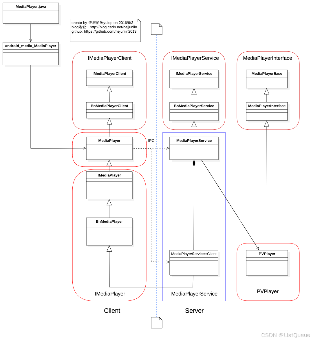 整个MediaPlayer在运行的时候,可以分成Client和Server两个部分,它们分别在两个进程中运行,它们之间使用Binder机制实现IPC通信。