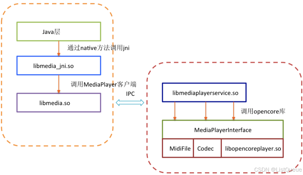 libmediaplayerservice.so是Media的服务器,它通过继承libmedia.so的类实现服务器的功能,而libmedia.so中的另外一部分内容则通过IPC和libmediaplayerservice.so进行通信。