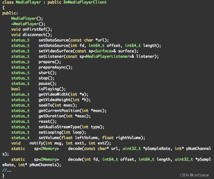 在这些头文件mediaplayer.h提供了对上层的接口,而其他的几个头文件都是提供一些接口类(即包含了纯虚函数的类),这些接口类必须被实现类继承才能够使用。