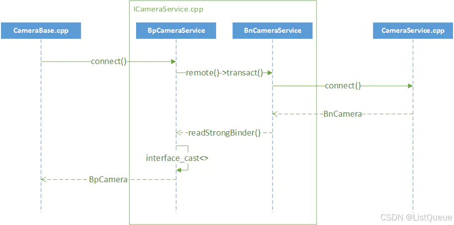 可以看到, 整个过程中主要涉及到两个Binder接口, ICamera和ICameraService, ICamera中的接口用于控制Camera具体操作, 比如设置参数, 打开/关闭预览等等, 而ICameraService中的接口负责连接Camera, 查询Camera信息(getNumberOfCameras() getCameraInfo()).