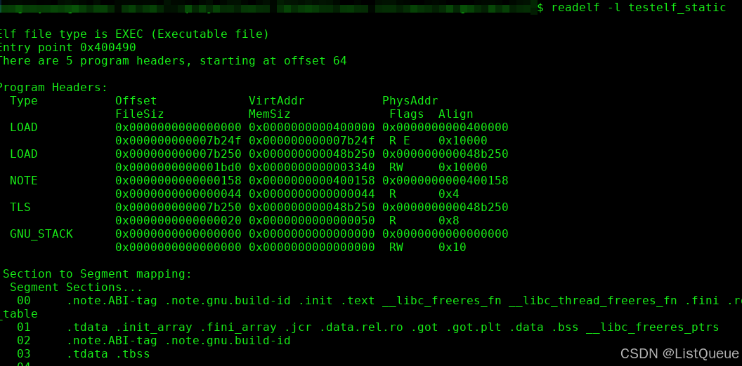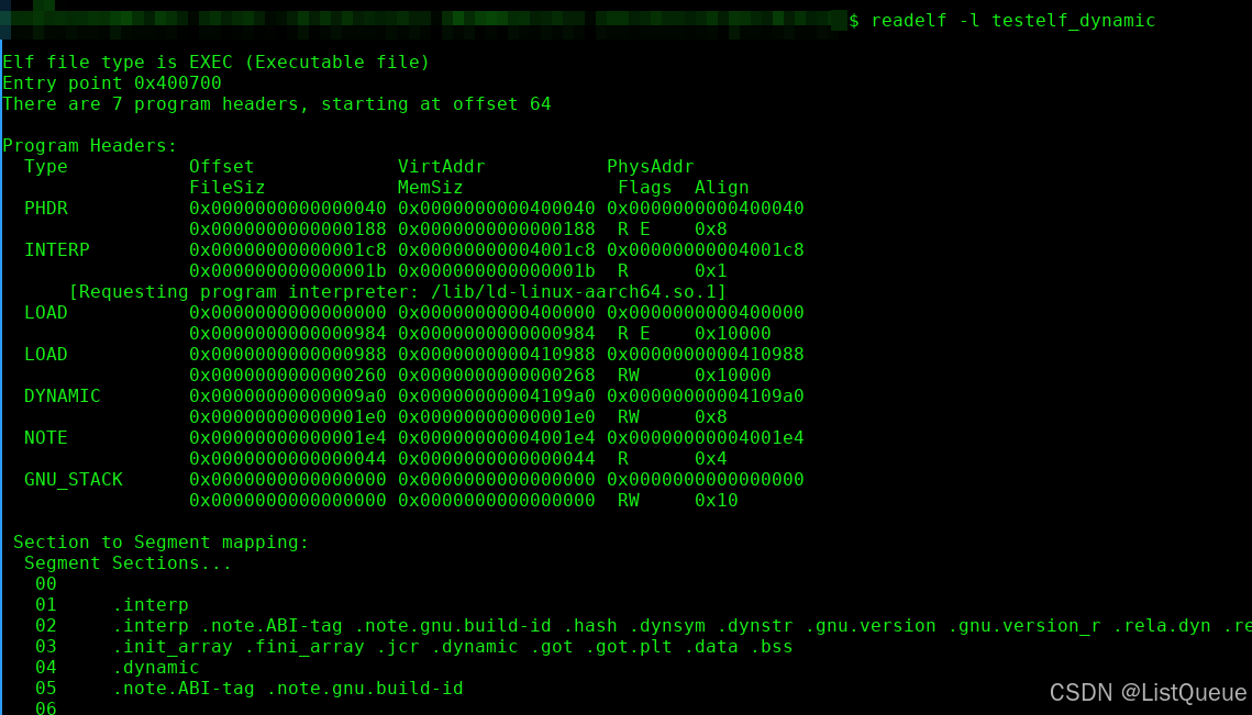 至此我们已经把目标执行程序和其所需要的解释器都加载初始化, 并且完成检查工作, 也加载了程序头表program header table, 下面开始加载程序的段信息
