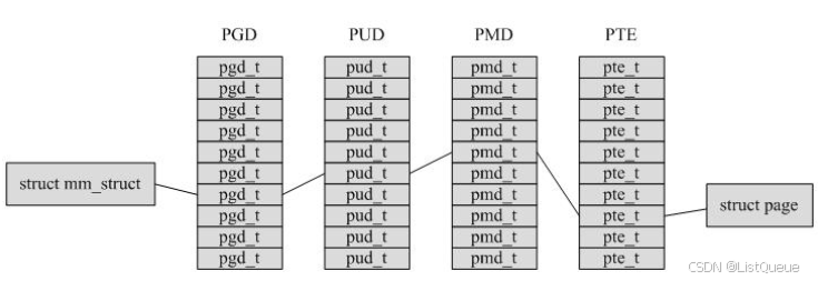 Linux分别采用pgd_t、pmd_t、pud_t和pte_t四种数据结构来表示页全局目录项、页上级目录项、页中间目录项和页表项。这四种 数据结构本质上都是无符号长整型unsigned long。