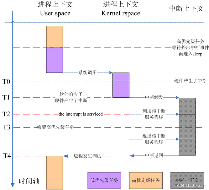 引入抢占式内核后,系统的平均任务响应时间会缩短,但是,实时性更关注的是:无论在任何的负载情况下,任务响应时间是确定的。因此,更需要关注的是worst-case的任务响应时间。这里有两个因素会影响worst case latency: