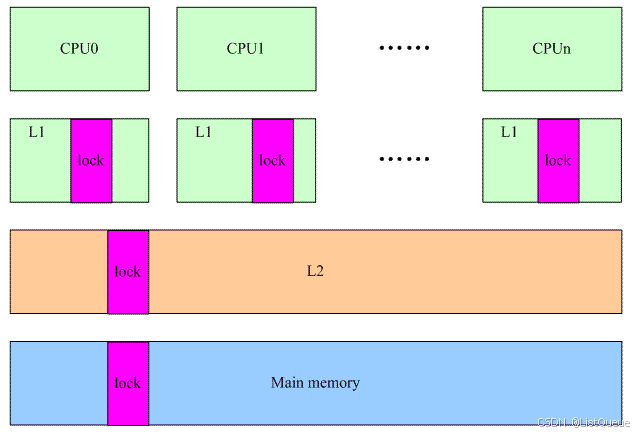 当线程在多个cpu上争抢进入临界区的时候,都会操作那个在多个cpu之间共享的数据lock。