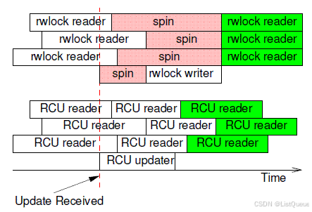 RCU和传统的锁机制不同,当RCU updater进入临界区的时候,即便是有reader在也无所谓,它可以长驱直入,不需要spin。