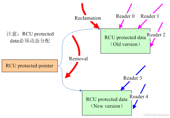 RCU涉及的数据有两种,一个是指向要保护数据的指针,称之RCU protected pointer。另外一个是通过指针访问的共享数据,我们称之RCU protected data 。