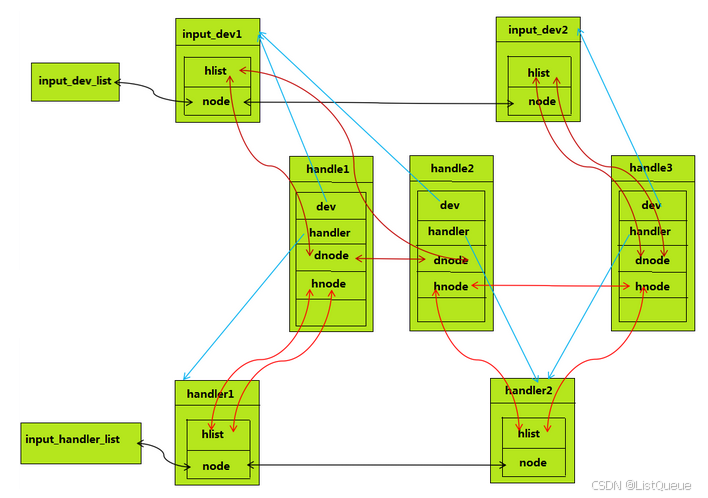 1.一个dev可以对应不只一个handler,比如一个mouse设备既可以匹配到mousedev里面的handler又可以匹配到evdev里面的handler,对应于上图的dev1,一个dev对应两个handler就必须有两个handle来连接它们。