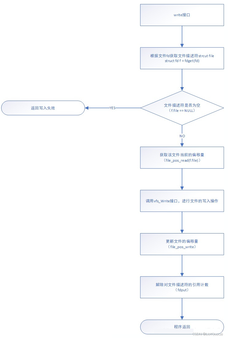3.调用vfs_write接口,从而调用该文件对应inode节点提供的write接口,实现write操作;