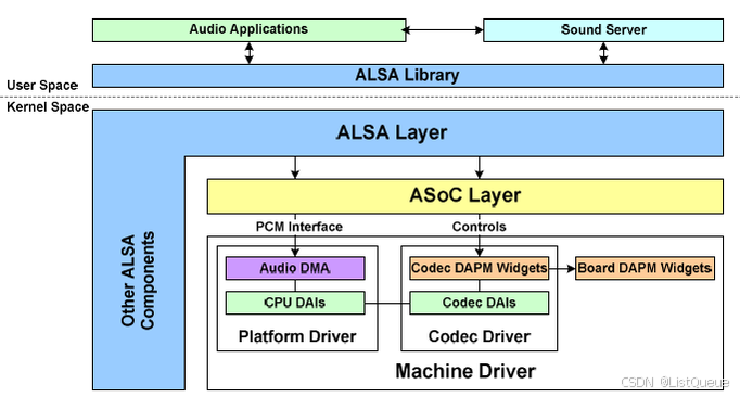 ALSA 的架构可以分为几个关键组件,它们协同工作以提供全面的音频功能: