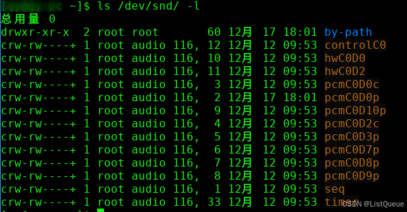 /dev/snd/目录下。常见的设备文件包括:- /dev/snd/pcmC0D0p:音频播放设备(PCM playback)