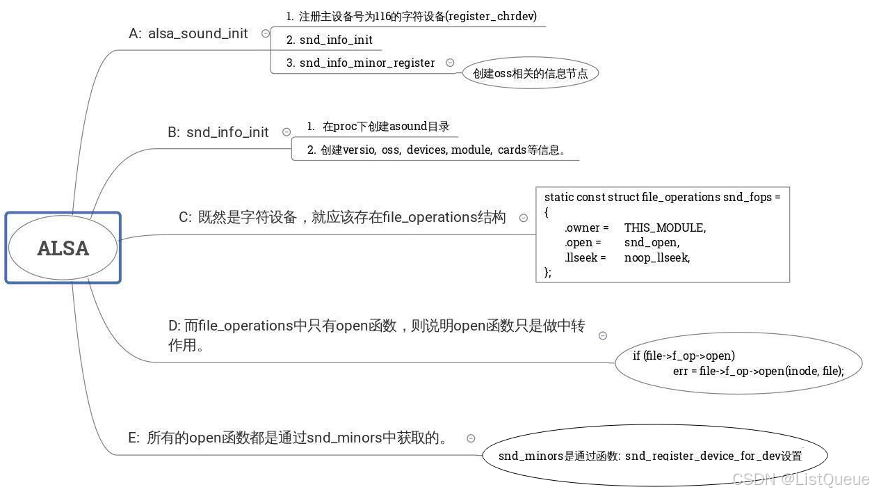 文件操作是snd_fops,snd_open接口比较重要,snd_open接口通过文件节点inode得到了次设备号,通过snd_minors数组得到对应的声音逻辑设备的文件操作,调用对应的open接口,并调用fops_put替换成了对应的逻辑设备的文件操作。