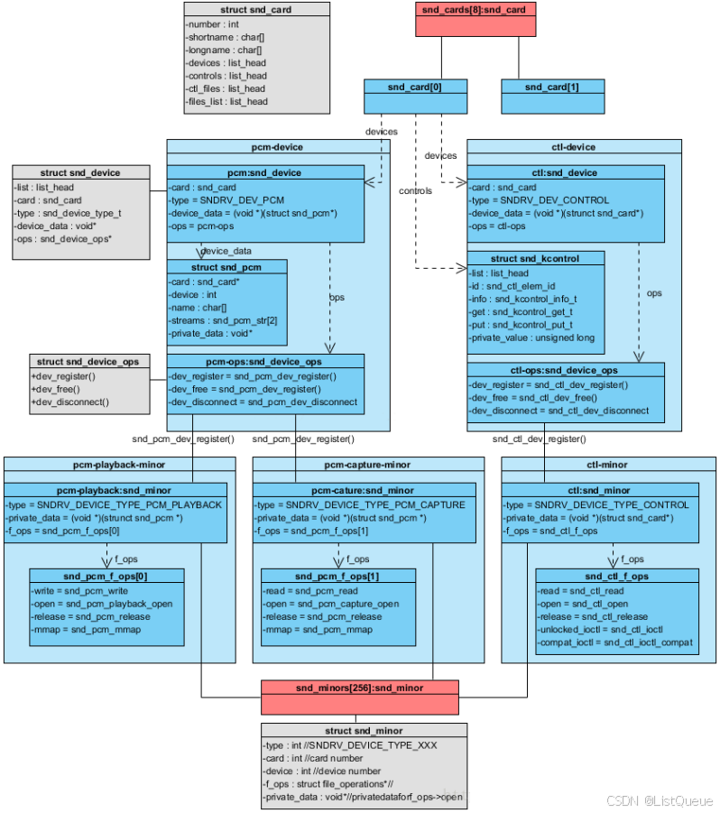 struct snd_card可以说是整个ALSA音频驱动最顶层的一个结构, 整个声卡的软件逻辑结构开始于该结构, 几乎所有与声音相关的逻辑设备都是在snd_card的管理之下, 声卡驱动的第一个动作通常就是创建一个snd_card结构体。