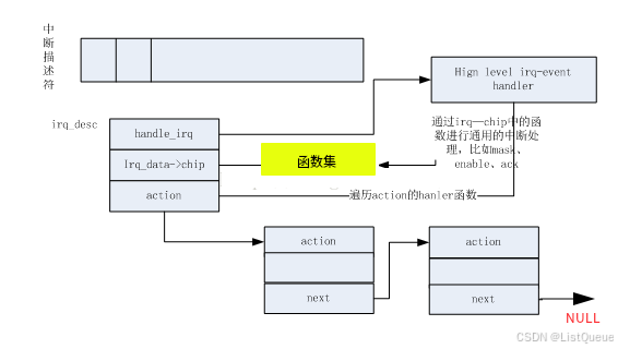- 工作队列:工作队列用于推迟处理复杂的任务,例如磁盘操作或文件系统处理。工作队列中的任务会在稍后的时间内执行,通常会在系统处于空闲状态时被调度。