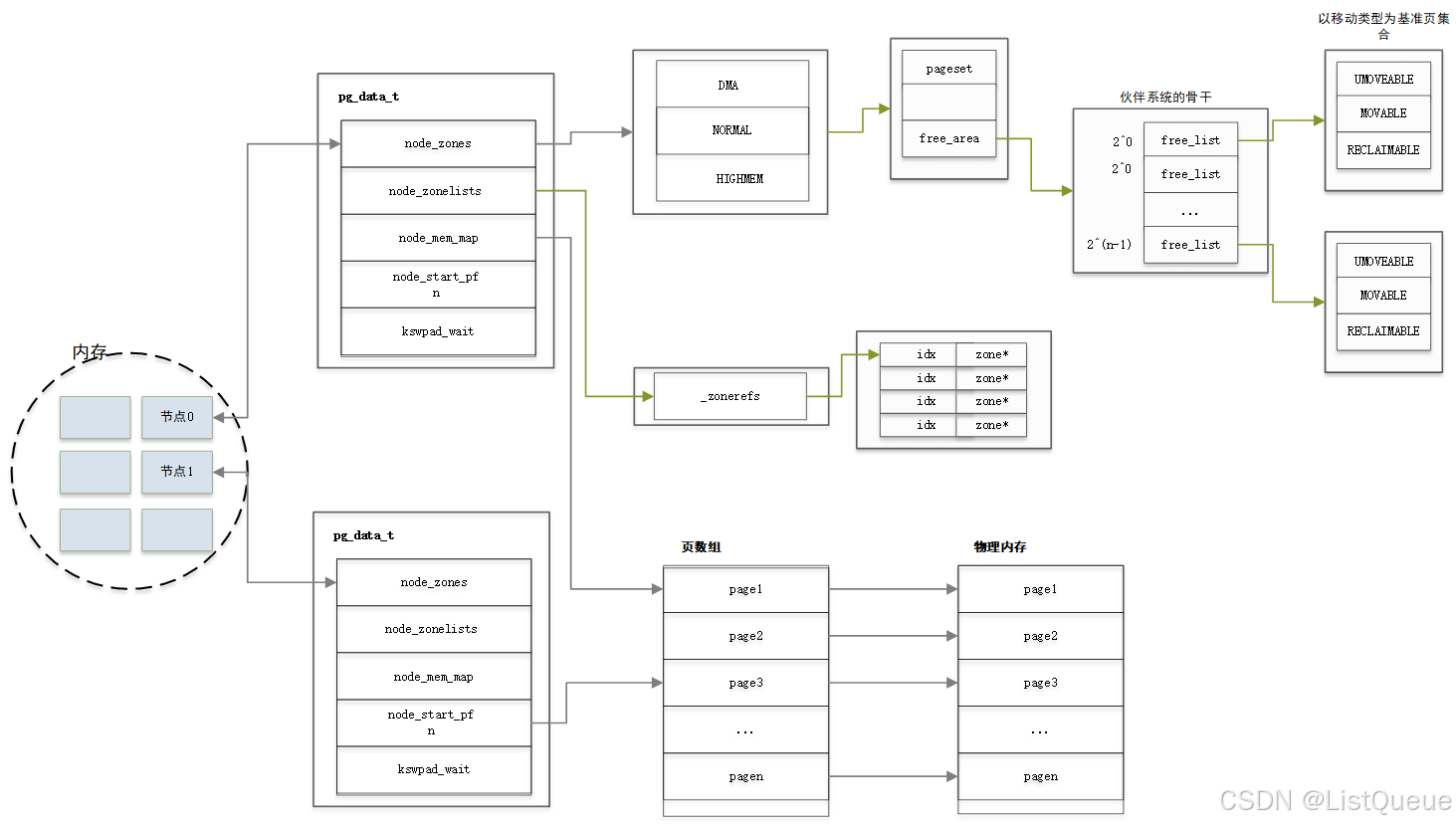 zonelist 在内核中的数据结构 struct zonelist 是一个 zone 数组,它包含了一个或多个内存区域(zone)。每个 zonelist 结构体在 NUMA 系统中通常是针对每个 NUMA 节点来维护的。