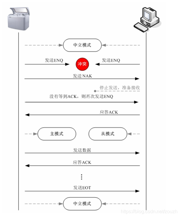 当仪器和 LIS 系统都使用双向通讯模式的时候,双方都可以成为发送者或接收者,所以在同一时刻双方可能都有数据需要发送给对方,这样双方就会在同时发送<ENQ>控制命令字符以获取主模式。由于 ASTM 协议是一个工作在单工传输模式下的协议,发送和接收都是同步进行的,发送一条数据请求就会停止发送等待收到应答后再进行下一条数据请求的发送。如果双方同时进行数据发送将引发冲突,ASTM 协议针对这种冲突制定了下面两条规则:在发送<ENQ>控制命令字符后收到<ENQ>控制命令字符,LIS 系统必须停止任何数据发送的尝试,必须准备好接收数据。当收到下一条<ENQ>控制命令字符,回复<ACK>或<NAK>来确认接收准备就绪。在发送<ENQ>控制命令字符后收到<ENQ>控制命令字符,仪器会发送<NAK>,等待 LIS 系统的 ACK,如果没有等到将继续发送另一个<ENQ>控制命令字符。