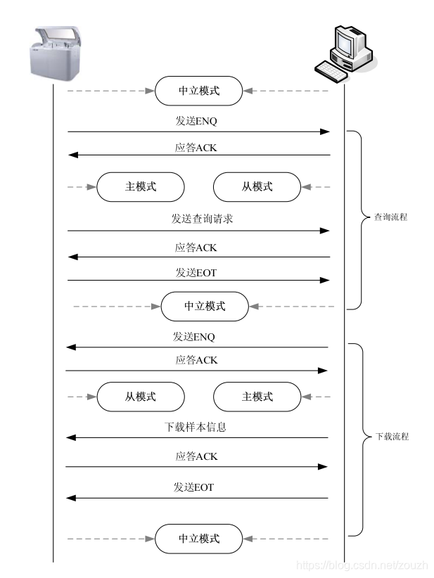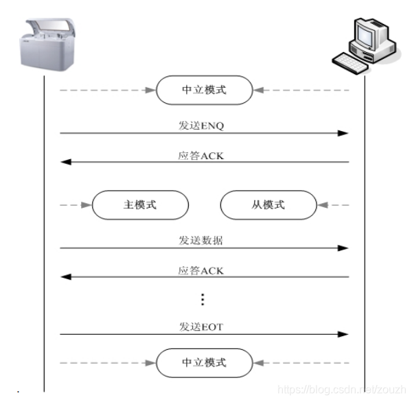 ASTM 协议确定了链路有三种状态,分别是主模式、从模式、中立模式。主模式为数据的发送方,将主动把数据发送给接收者。从模式为被动接收者,从发送者接收数据后只做相关控制命令的应答。中立模式为一种等待模式,在没有数据需要发送和有效数据接收的时候为中立模式。仪器和 LIS 系统任何一方进入主模式后,别一方必须进入从模式,两方可以同时进入中立模式,任何一方在某一时刻只能进入一种模式。仪器和 LIS 系统同时无数据需要发送时,这个时候两方将都进入中立模式。如果一方有数据需要发送,例如仪器需要从 LIS 系统查询样本信息,仪器将先发送<ENQ>控制命令字符给 LIS 系统,发送完成后仪器将不再处理任何接收到的除了<ACK>、<NAK>、<ENQ>之外的命令或数据。LIS 系统收到<ENQ>后将应答<ACK>控制命令字符,如果应答完成,这个时候 LIS 系统将进入从模式,做好接收数据的准备。此时仪器将进入主模式,将进行请求数据的发送。当请求数据