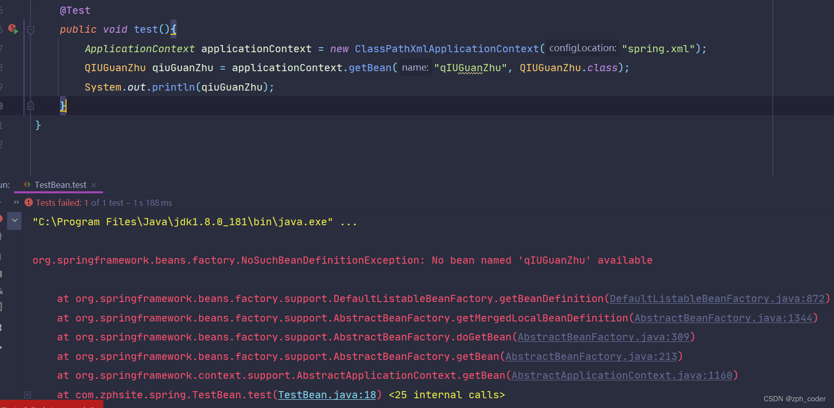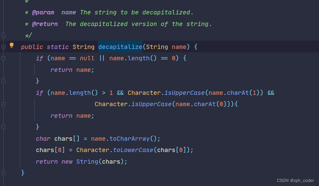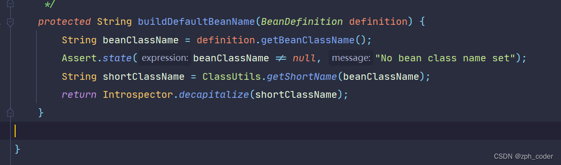 通过这个源码我们可以得出结论,如果你的类名的第一个和第二个字母是大写的话就直接返回类名作为默认bean的名称(这也就是前面QIUGuanZhu这个bean报错的原因),如果是正常的驼峰命名就是首字母小写即可。