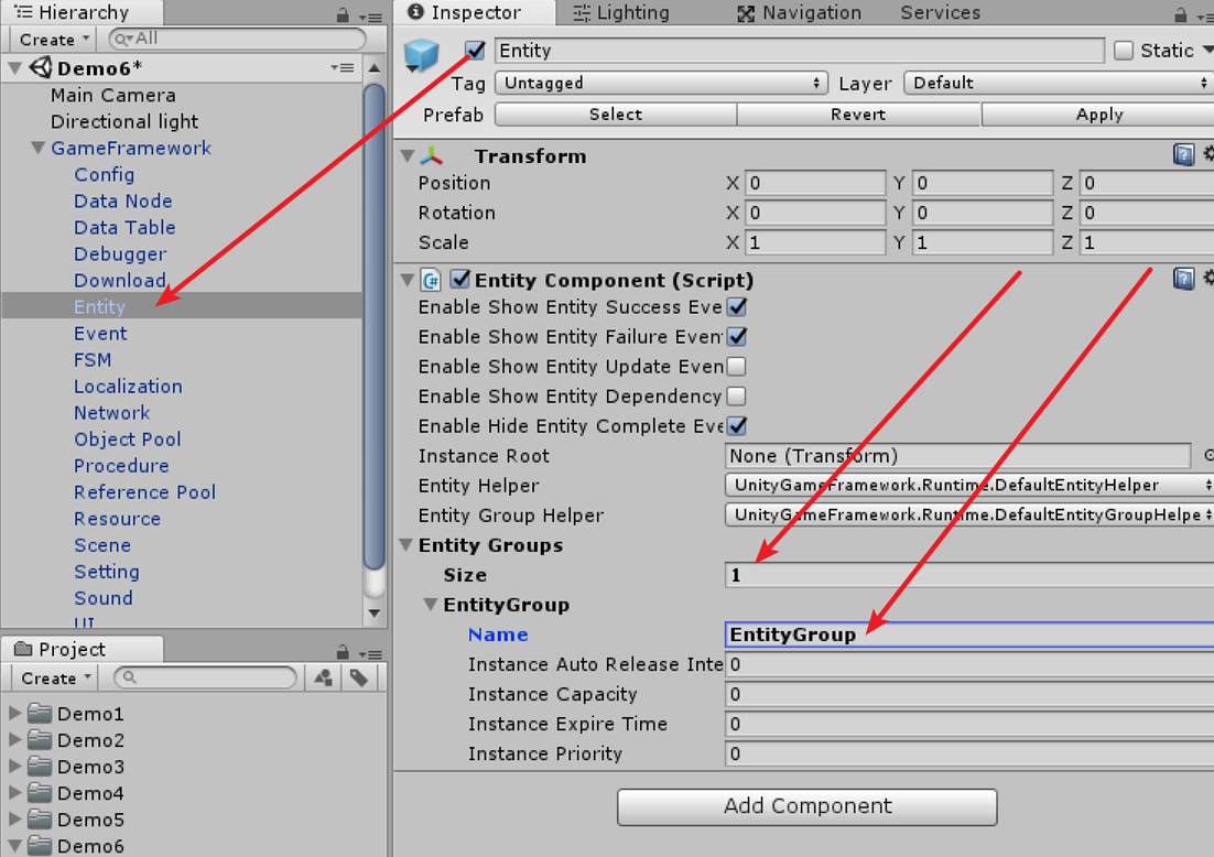 entityComponent.ShowEntity<Demo6_HeroLogic>(1, "Assets/Demo6/CubeEntity.prefab", "EntityGroup");