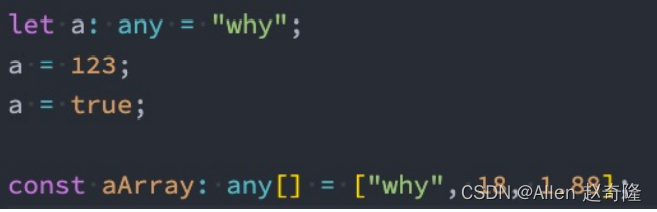 2.我们给一个any类型的变量赋值任何的值,比如数字、字符串的值;