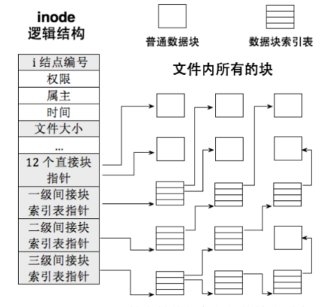 如果文件很大(比如几百 MB),12 个直接块不够用,就需要 “间接块”: