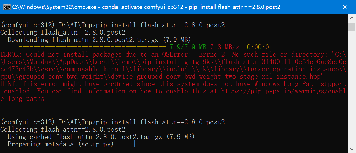 fatal : Could not open output file C:\Users\Monday\AppData\Local\Temp\pip-install-4ls6iq2w\xformers_bcf4f67735df4e9aae791b64a7228251\build\temp.win-amd64-cpython-312\Release\Users\Monday\AppData\Local\Temp\pip-install-4ls6iq2w\xformers_bcf4f67735df4e9aae791b64a7228251\third_party\flash-attention\csrc\flash_attn\src\flash_bwd_hdim192_bf16_causal_sm80.obj.d