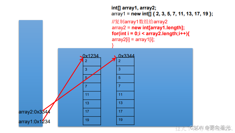 (1)创建一个名为ArrayTest004的类,在main()方法中声明array1和array2两个变量, 他们是int[]类型的数组。