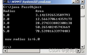 (3)在main方法中调用printAreas()方法,调 用完毕后输出当前半径值。程序运行结果如图所示。