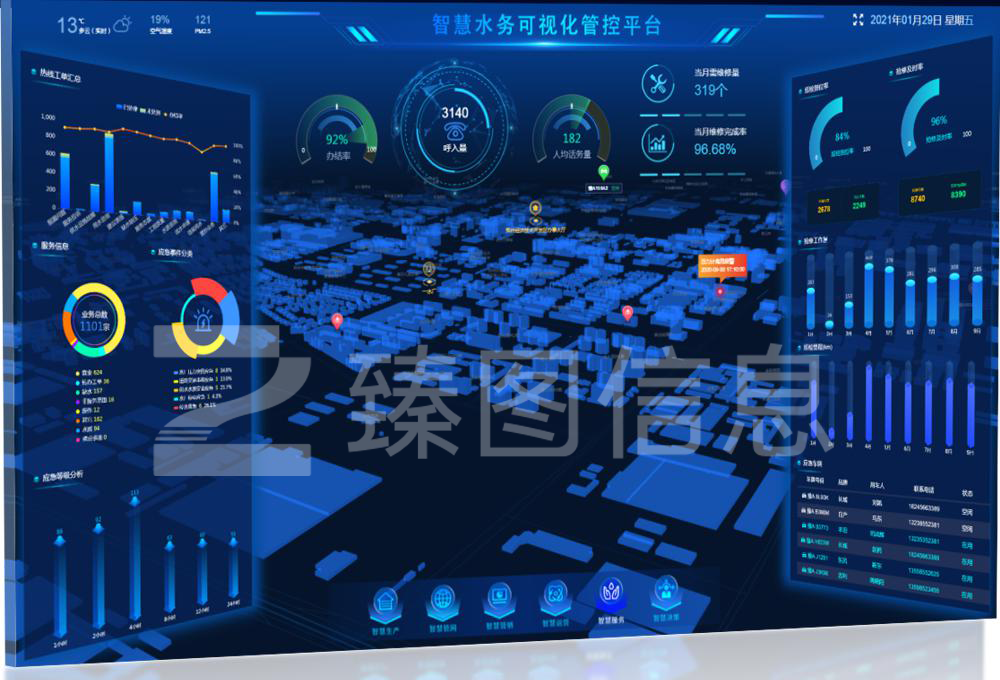 臻图信息利用ZTMapGIS系统构建三维可视化智慧水务平台,实现供水管网的实时监控、异常报警、数据分析和泄漏检测。该系统结合物联网、大数据等技术,提升供水管理效率和安全性,确保从源头到用户的安全、智能供水。