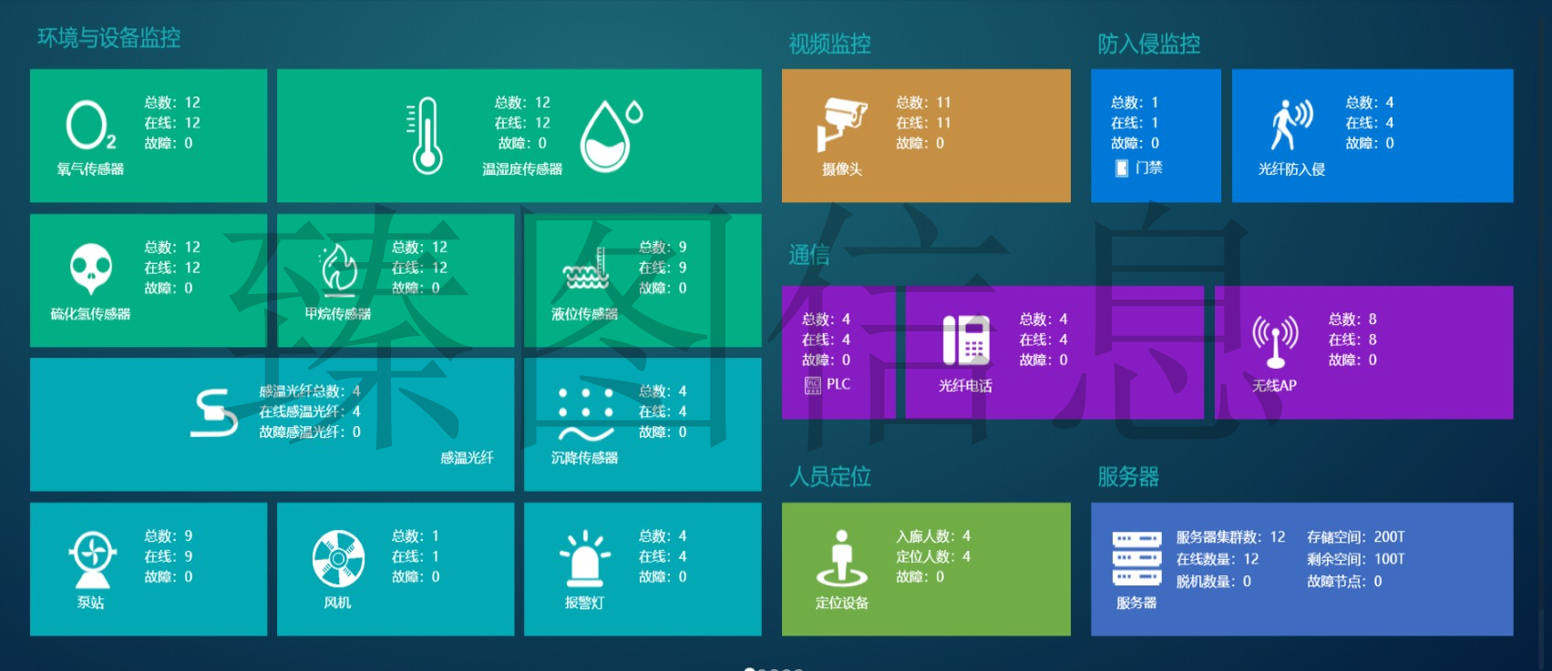 平台主界面完成各分系统情况的全局性展现,用图形界面的方法提升视觉效果感染力,根据图色区分正常、异常情况。