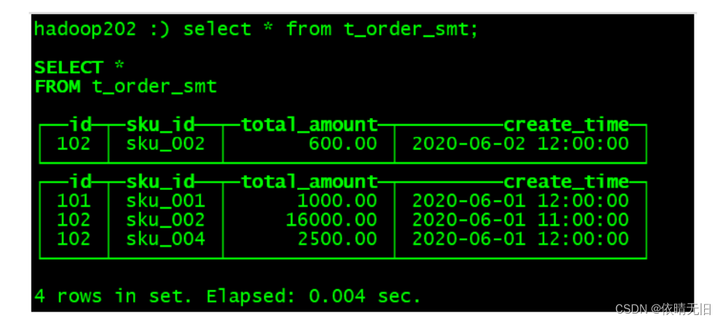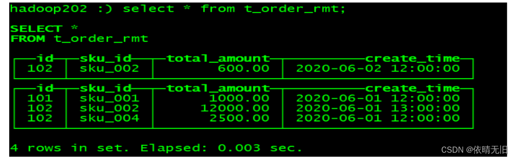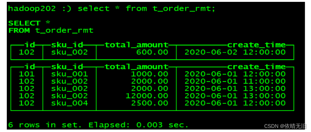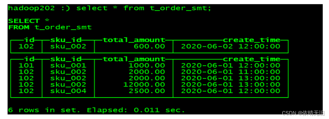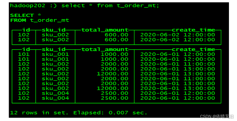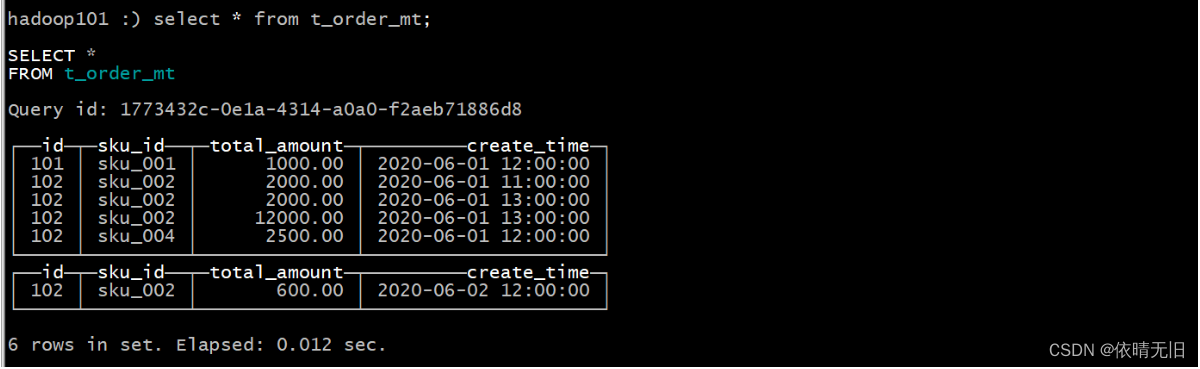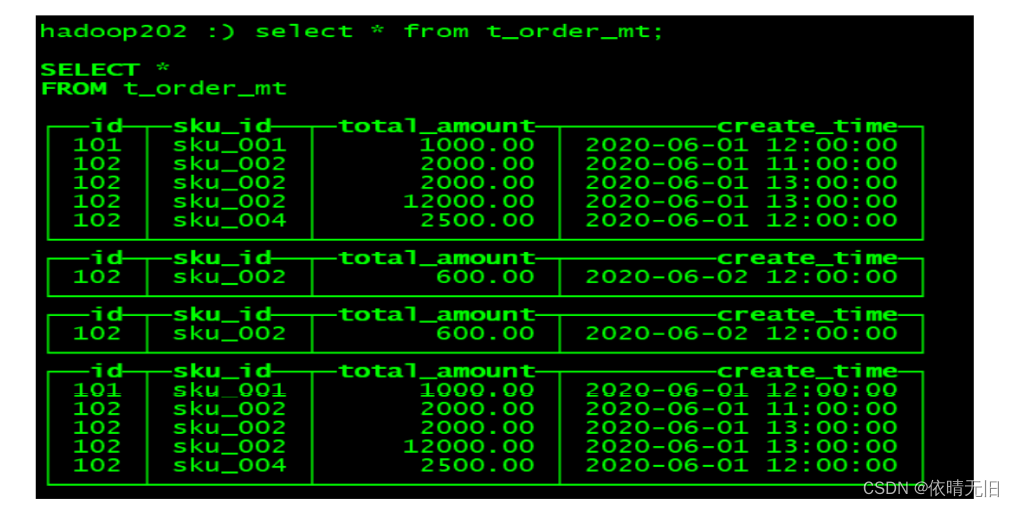 主键不唯一,按照年月日来进行分区,同时,他们的排序是分区内的排序,排序中规定的id,sku_id表示如果id相同,就会进行sku_id排序。