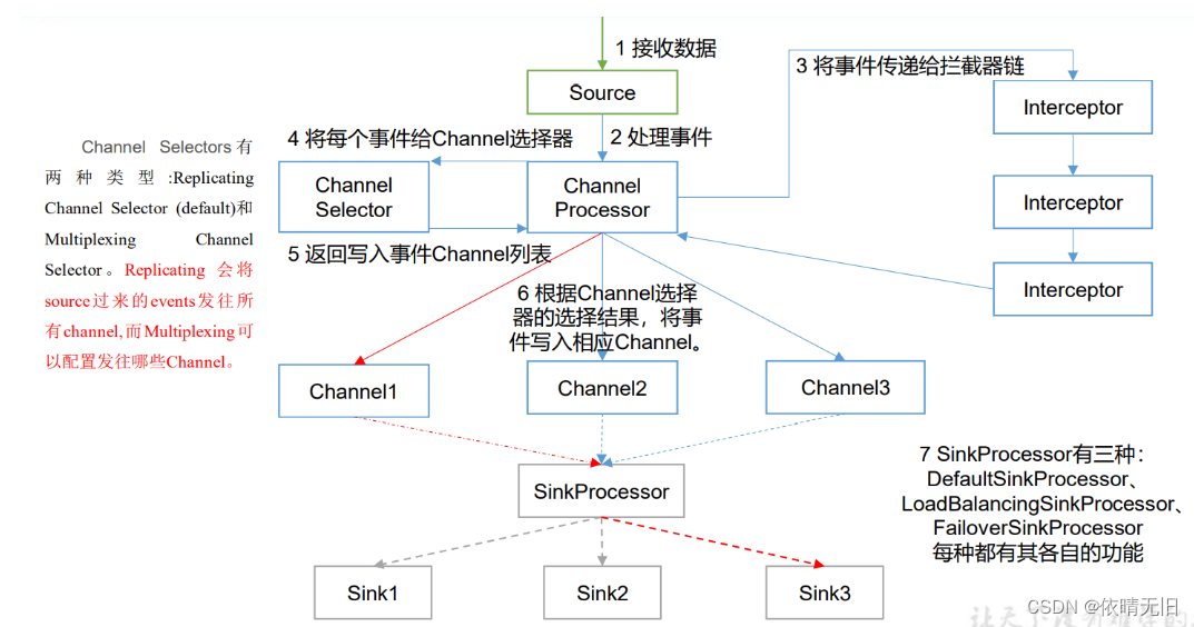 ChannelSelector 的作用就是选出 Event 将要被发往哪个 Channel。其共有两种类型, 分别是 Replicating(复制)和 Multiplexing(多路复用)。