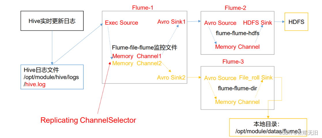 使用 Flume-1 监控文件变动,Flume-1 将变动内容传递给 Flume-2,Flume-2 负责存储 到 HDFS。同时 Flume-1 将变动内容传递给 Flume-3,Flume-3 负责输出到 Local FileSystem。